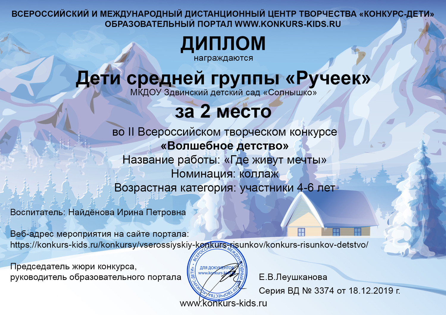 Всероссийский и международный дистанционный центр творчества "Конкурс- дети", Диплом 2 место, декабрь 2019г |