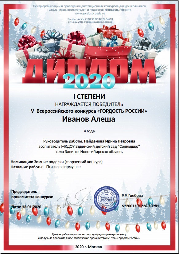 V Всероссийский конкурс "Гордость России", Диплом 1 степени, январь 2020г |