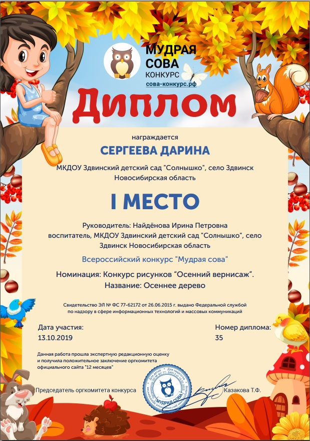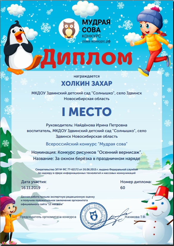 Всероссийский конкурс "Мудрая сова", Диплом 1 место, ноябрь 2019г |