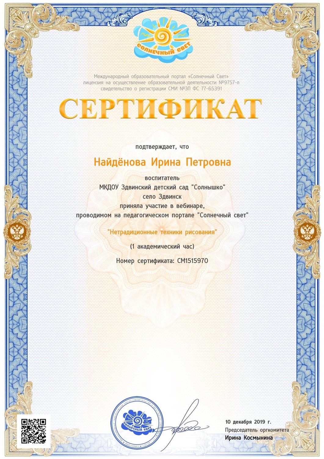 Вебинар «Нетрадиционные техники рисования», Сертификат |