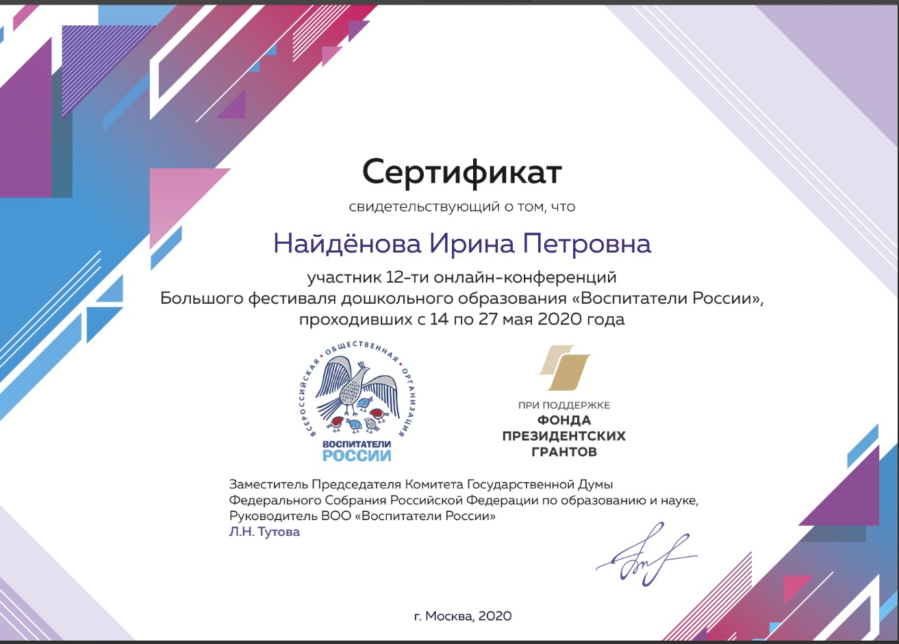 Участник 12-ти онлайн- конференций Большого фестиваля дошкольного образования «Воспитатели России», Сертификат |