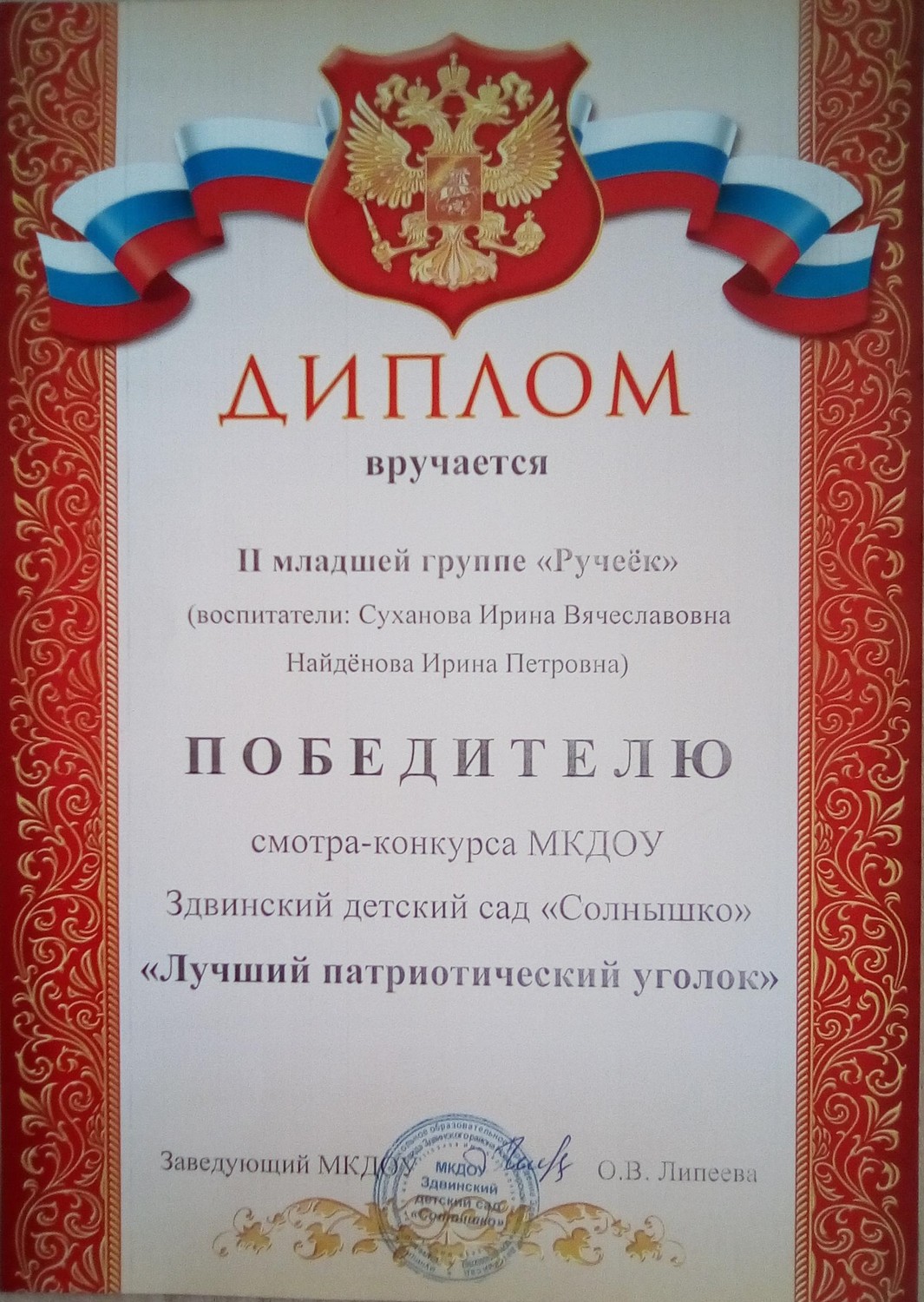 | МКДОУ Здвинский детский сад "Солнышко" | Смотр-конкурс "Лучший патриотический уголок". Диплом победителя, 2020г |