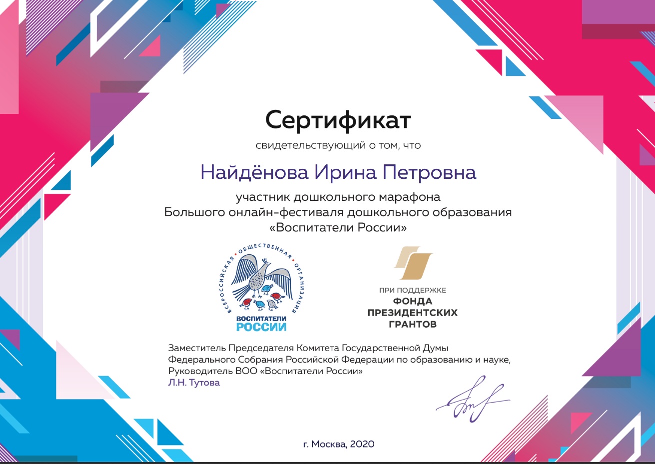 Участник дошкольного марафона Большого онлайн- фестиваля дошкольного образования «Воспитатели России», Сертификат |