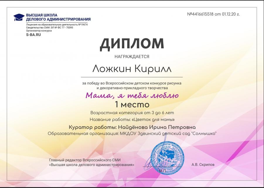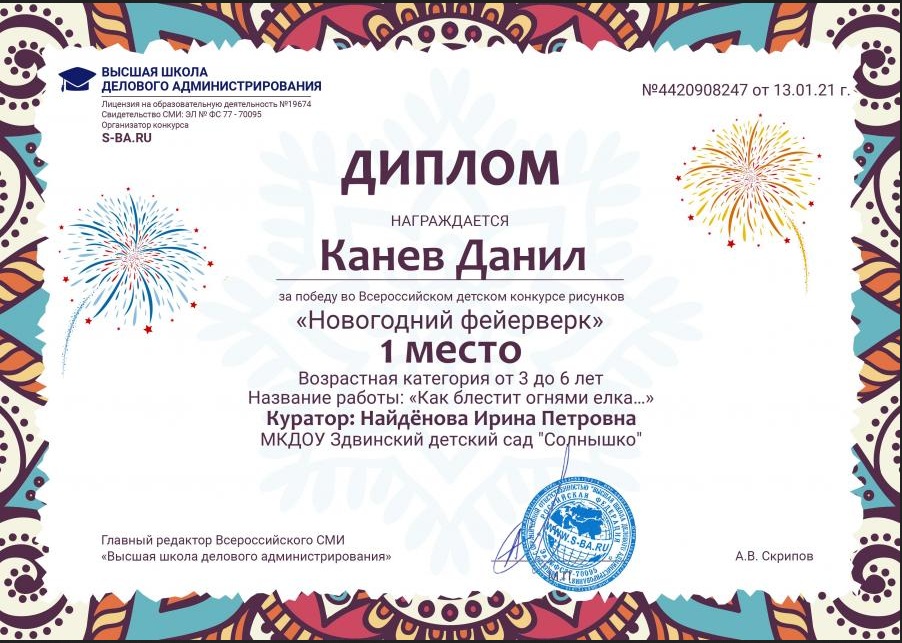 Всероссийский детский конкурс рисунков на портале ВШДА, Диплом 1 место, январь 2021г |