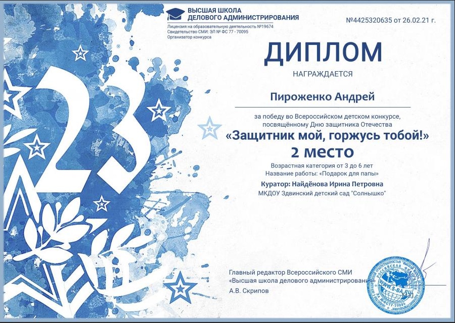 Всероссийский детский конкурс рисунков на портале ВШДА, Диплом 2 место, январь 2021г |