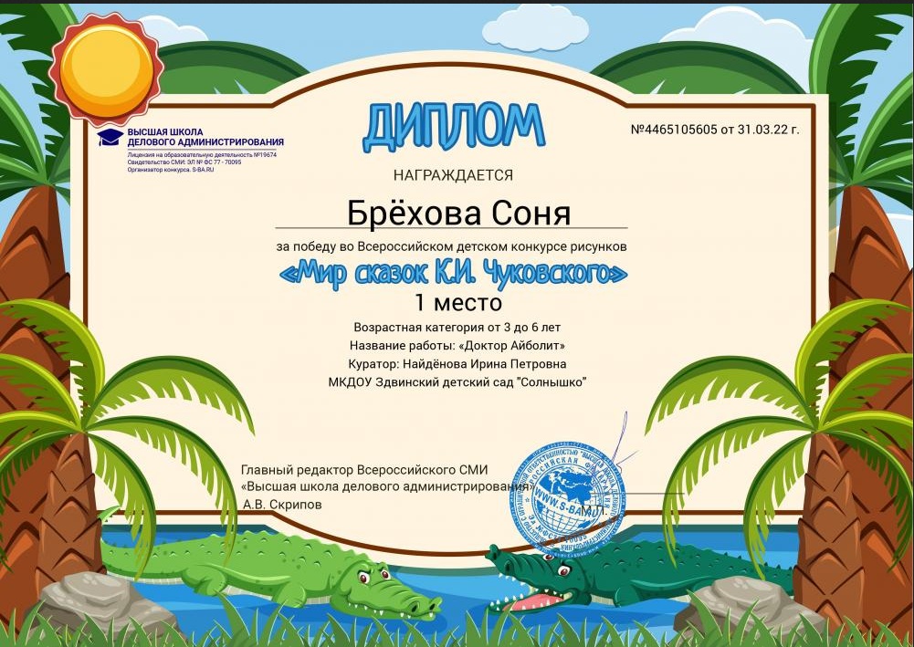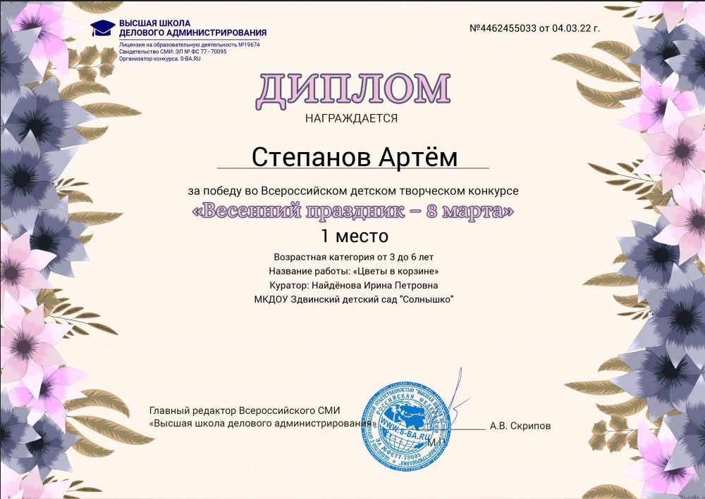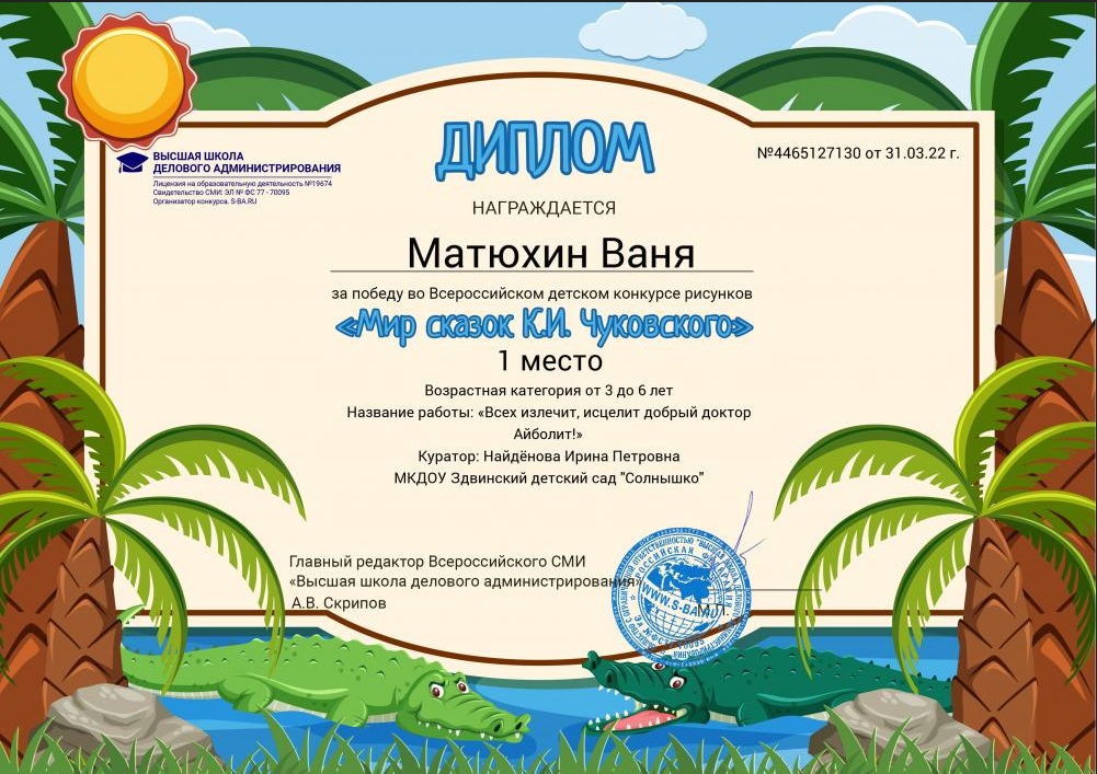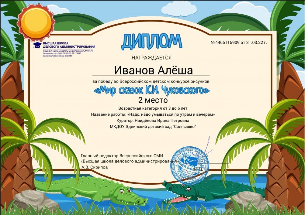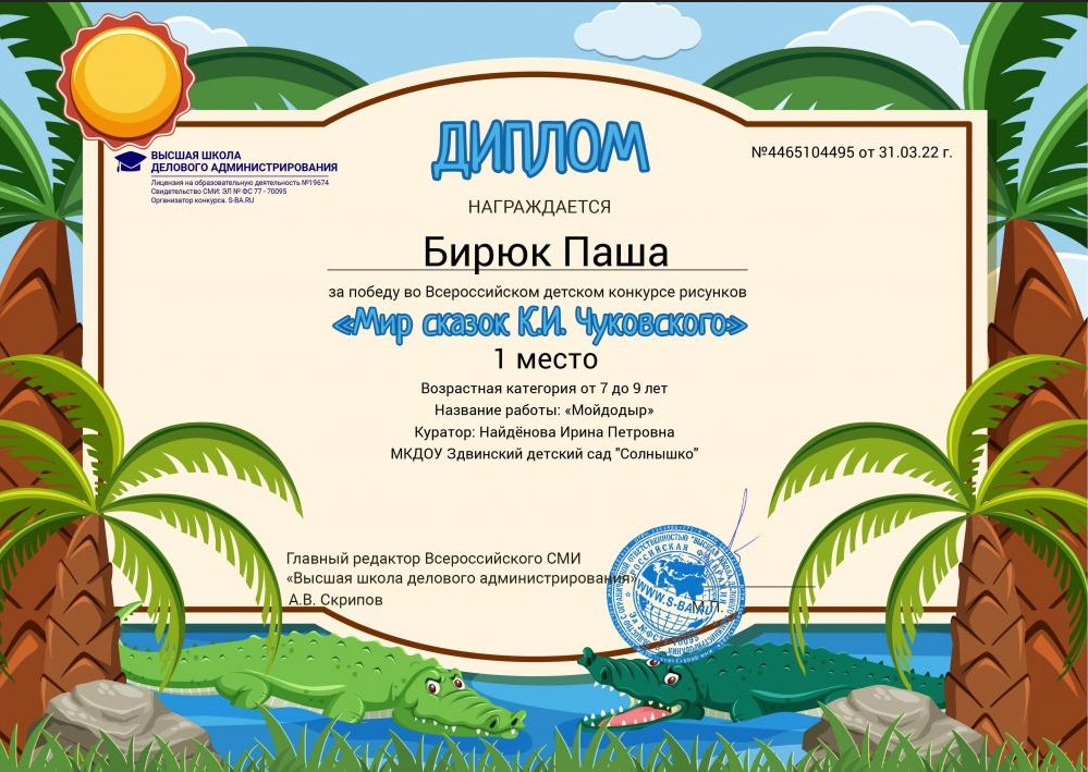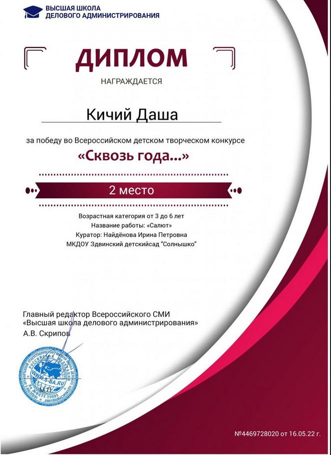 | Всероссийский детский творческий конкурс на портале ВШДА, Диплом 2 место, май 2022г | Всероссийский детский творческий конкурс на портале ВШДА, Диплом 1 место, март 2022г | ||