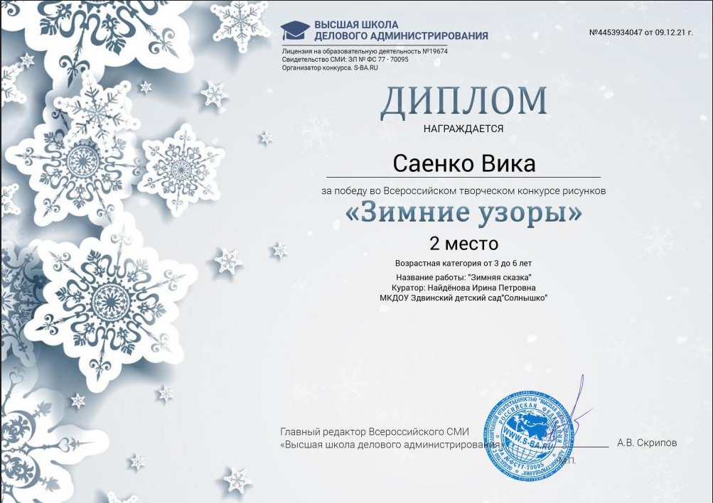 Всероссийский творческий конкурс рисунков на портале ВШДА, Диплом 2 место, декабрь 2021г |