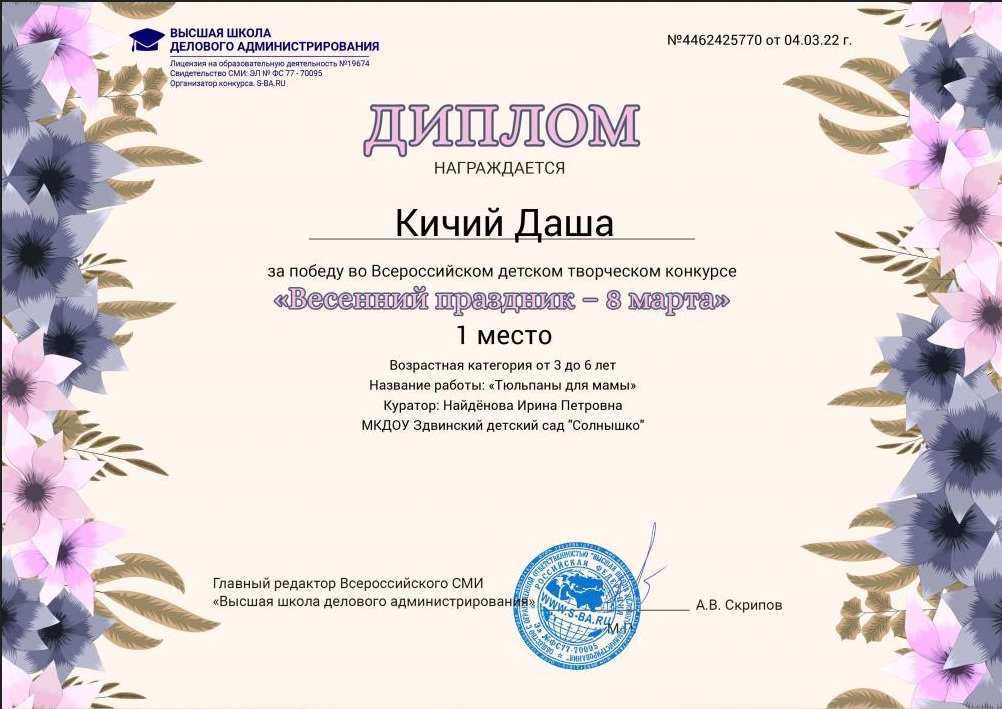 | Всероссийский детский творческий конкурс на портале ВШДА, Диплом 1 место, март 2022г | Всероссийский детский творческий конкурс на портале ВШДА, Диплом 1 место, март 2022г | ||