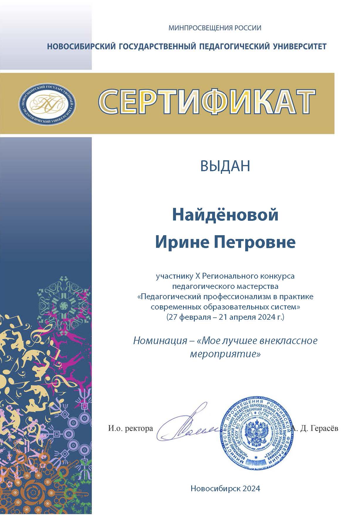 Х Региональный конкурс педагогического мастерства "Педагогический профессионализм в практике современных образовательных систем", НГПУ, 2024 |