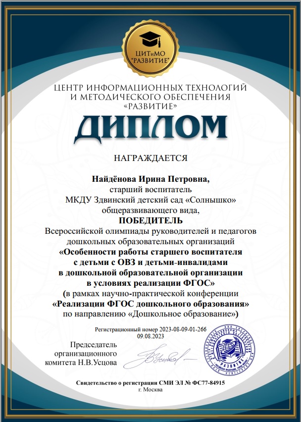 ЦИТиМО «Развитие» всероссийская олимпиада руководителей и педагогов дошкольных образовательных организаций «Особенности работы старшего воспитателя с детьми с ОВЗ и детьми – инвалидами в дошкольной образовательной организации в условиях реализации ФГОС», Диплом победителя, август 2023г