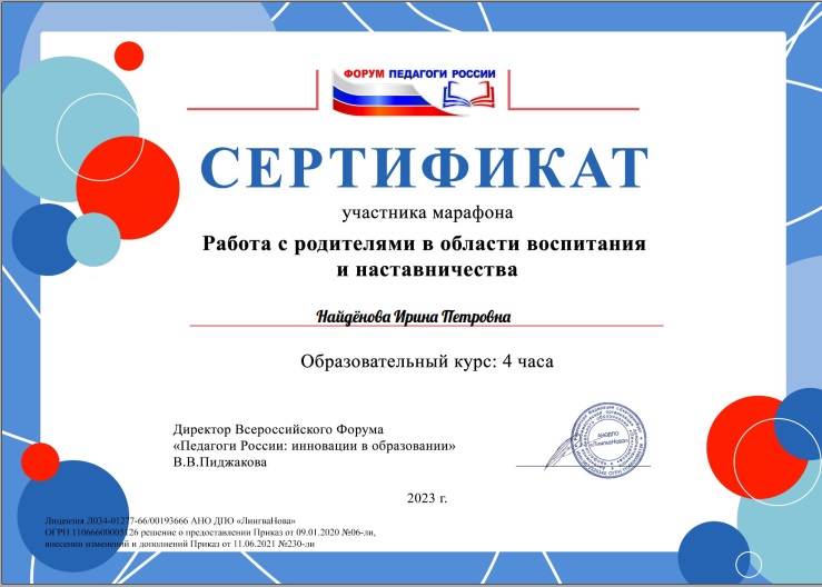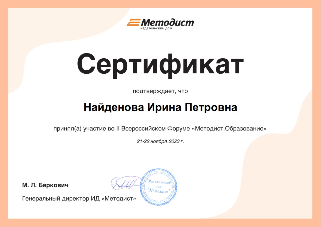 Второй Всероссийский Форум «Методист. Образование» Семинар «Развитие дошкольников в детском саду и дома: решаем задачи ФОП ДО» Инпут «Как гармонично включить детей с ОВЗ в образовательную среду детского сада», Сертификат, ноябрь 2023г