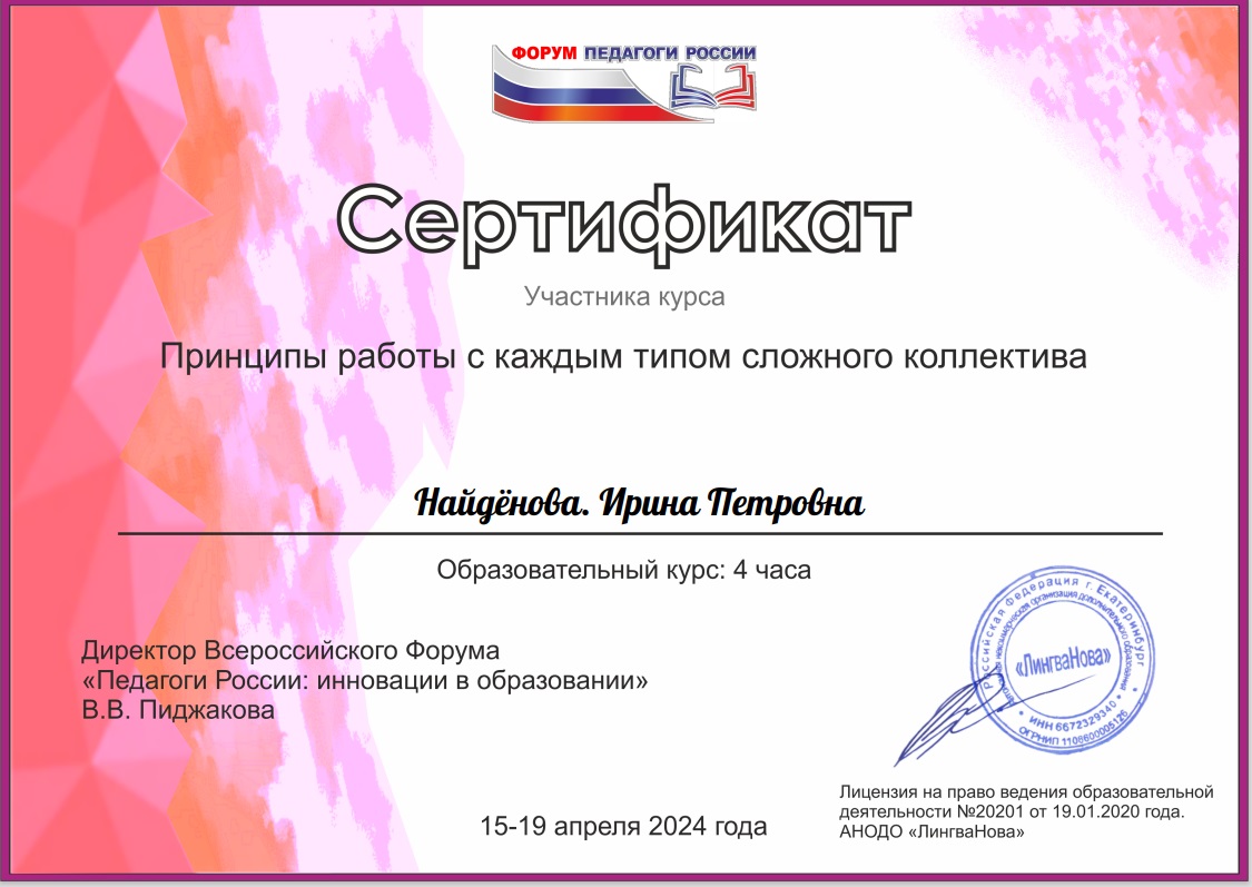 Всероссийский форум "Педагоги России: инновации в образовании" Принципы работы с каждым типом сложного коллектива, апрель 2024г |