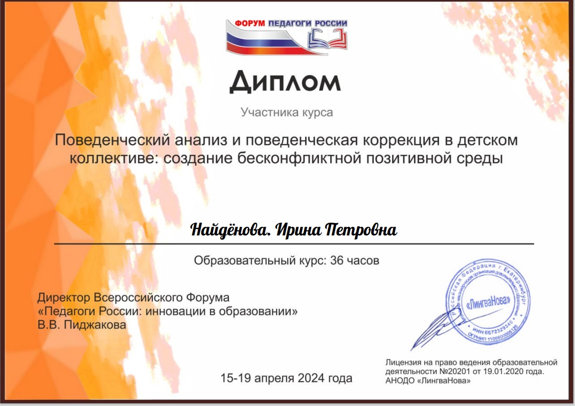 Всероссийский форум "Педагоги России: инновации в образовании" Поведенческий анализ и поведенческая коррекция в детском коллективе: создание бесконфликтной позитивной среды, апрель 2024г |