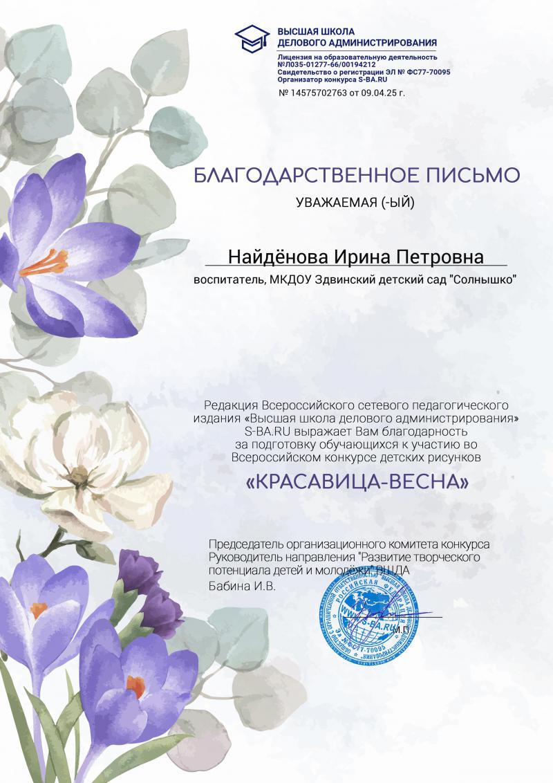 ВШДА Всероссийский конкурс детских рисунков «Красавица- весна», г. Екатеринбург, Благодарственное письмо, апрель 2025 | ![]() |