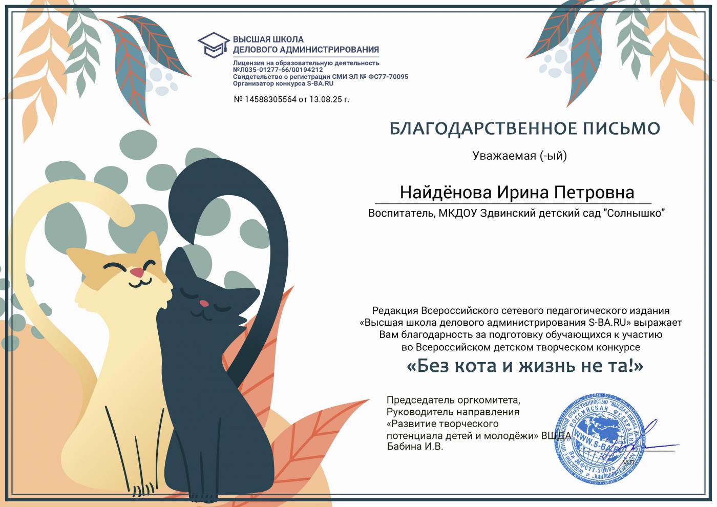 ВШДА Всероссийский детский творческий конкурс «Без кота и жизнь не та», г. Екатеринбург, Благодарность, август 2025 |