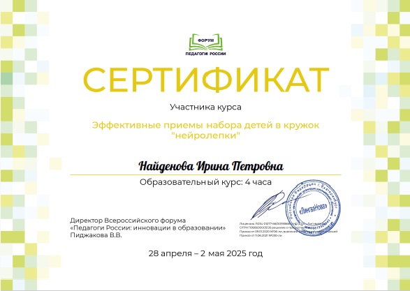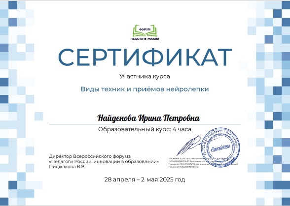 Форум Педагоги России "Виды техник и приемов нейролепки", Сертификат, 4 ч, апрель 2025г |