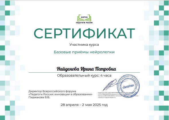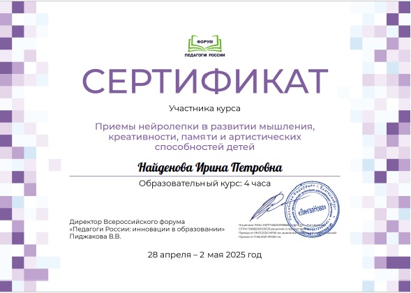 Форум Педагоги России "Приемы нейролепки в развитии мышления, креативности, памяти и артистических способностей детей", Сертификат, 4 ч, апрель 2025г |