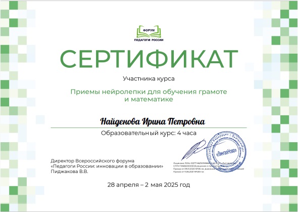 Форум Педагоги России "Приемы нейролепки для обучения грамоте и математики", Сертификат, 4 ч, апрель 2025г | ![]() |