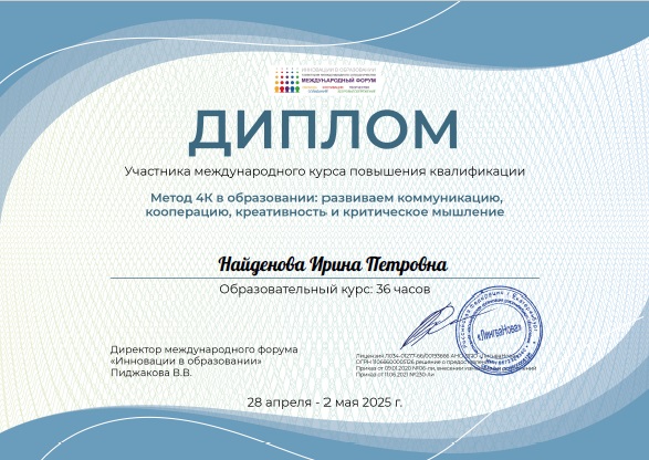 Форум Педагоги России "Метод 4Кв образовании: развиваем коммуникацию, кооперацию, креативность и критическое мышление", Диплом, 36 ч, апрель 2025г | ![]() |