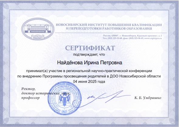 Региональная научно- практическая конференция "Краеведческое образование - основа становления духовно - нравственных ценностей у детей дошкольного возраста", НИПКиПРО, Сертификат, г.Новосибирск, октябрь 2024 |