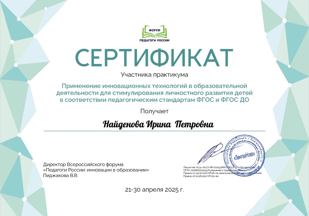 Форум Педагоги России Практикум "Применение инновационных технологий в образовательной деятельности для стимулирования личностного развития детей в соответствии педагогическим стандартам ФГОС И ФГОС ДО" Сертификат, апрель 2025г | ![]() |