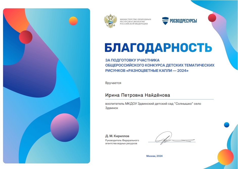 Эколого-просветительский общероссийский конкурс детских тематических рисунков «Разноцветные капли», Росводресурсы, Благодарность, октябрь 2024г |