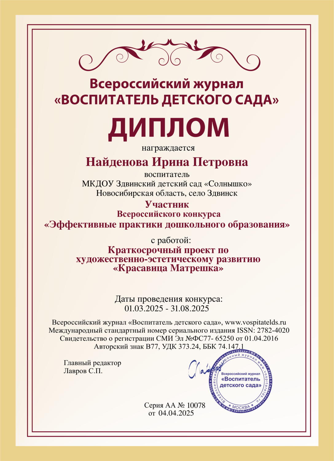 Всероссийский журнал «Воспитатель детского сада» "Эффективные практики дошкольного образования", Диплом участника, апрель 2025г. |