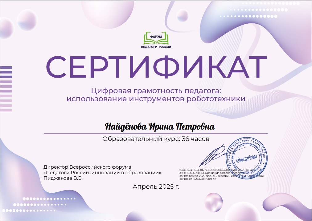 Всероссийский форум "Педагоги России: инновации в образовании" "Цифровая грамотность педагога: использование инструментов робототехники", Сертификат, 36 ч, апрель 2025г. |