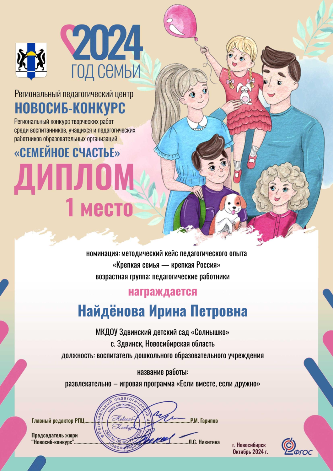 Региональный Образовательный Центр «Новосиб-конкурс», «СЕМЕЙНОЕ СЧАСТЬЕ», Диплом 1 место, октябрь 2024 |