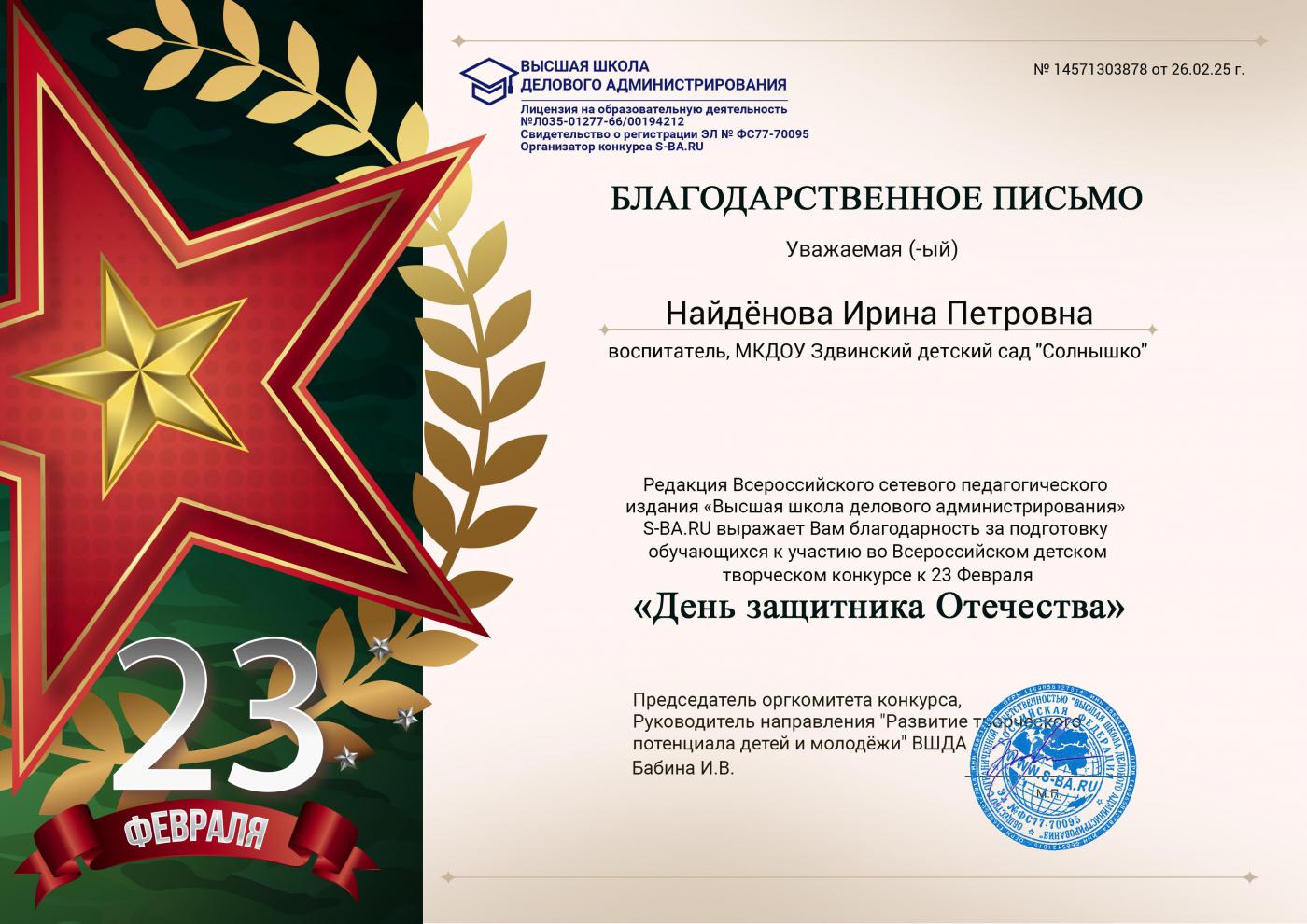 ВШДА Всероссийский детский творческий конкурс к 23 Февраля «День защитника Отечества», г. Екатеринбург, февраль 2025 | ![]() |