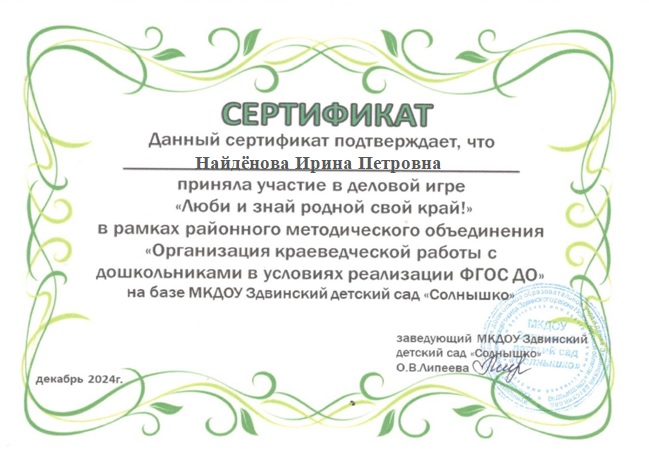 МКДОУ Здвинский детьский сад "Солнышко", участие в деловой игре "Люби и знай родной свой край", декабрь 2024 |