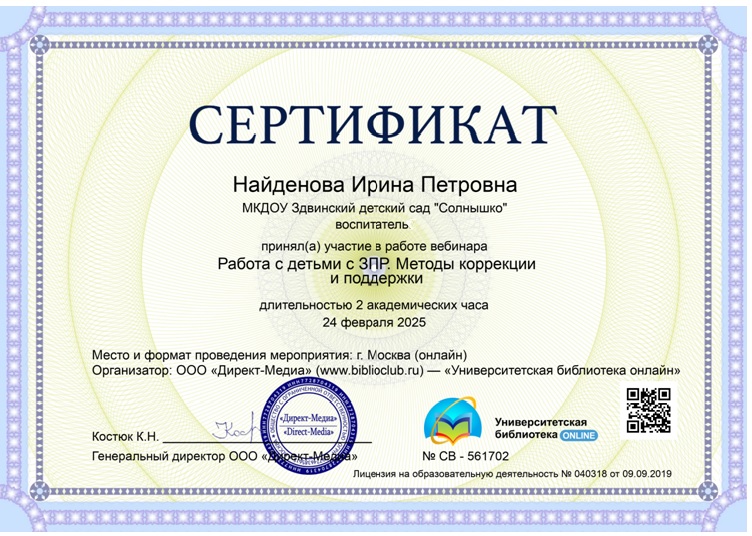ООО "Директ-Медиа", вебинар "Работа с детьми с ЗПР. Методы коррекции и поддержки", г. Москва, 24 февраля 2025г, 2 ч. |