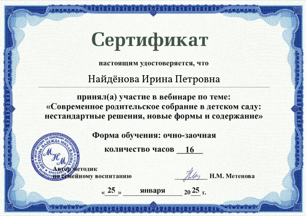 Вебинар "Трудовая деятельность детей как основа нравственно- патриотического воспитания в условиях реализации ФГОС и ФОП ДО", Сертификат, 16 ч., апрель 2025г |
