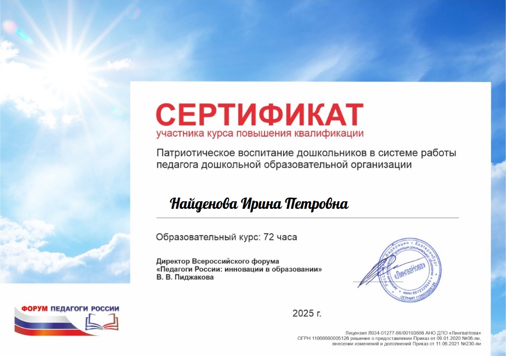 Всероссийский Форум "Педагоги России: инновации в образовании" "Патриотическое воспитание дошкольников в системе работы педагога дошкольной образовательной организации", 72 часа, май 2025г |