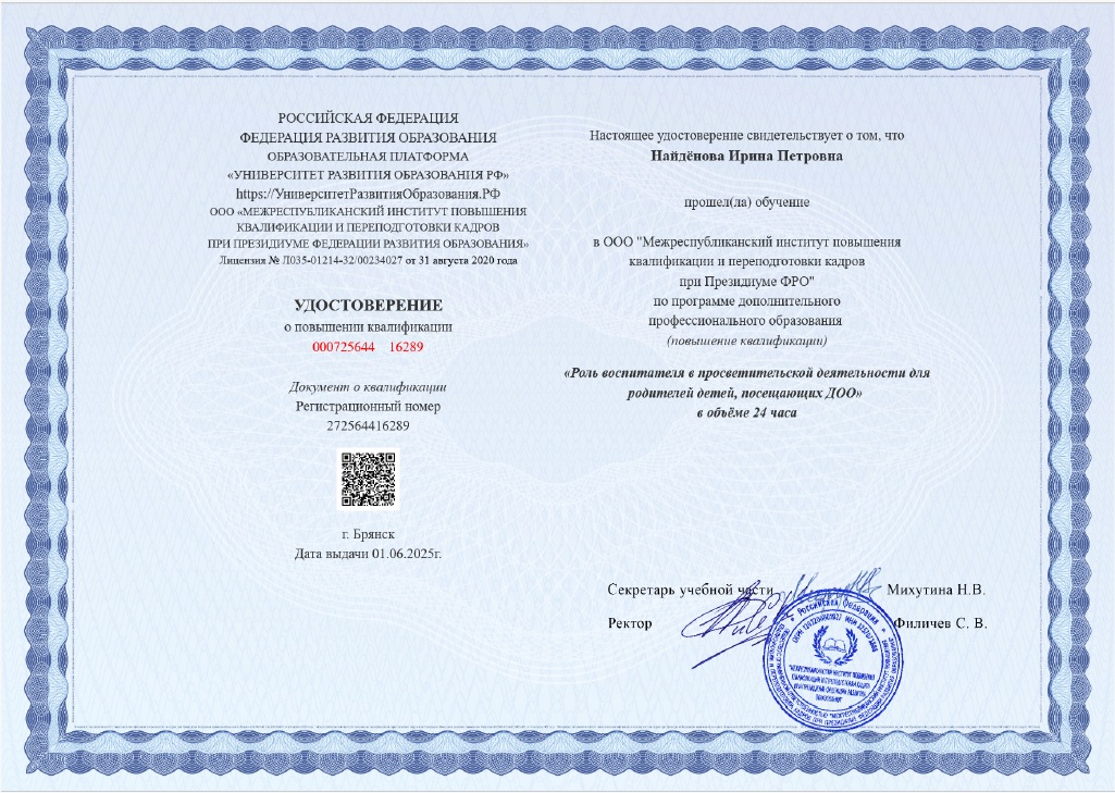 Университет развития образования РФ "Роль воспитателя в просветительской деятельности для родителей детей, посещающих ДОО", г. Брянск, 24 часа, июнь2025г |