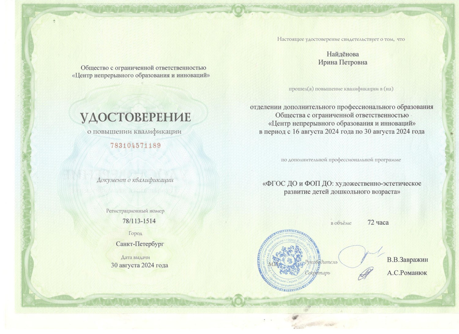 ООО "Центр непрерывного образования и инноваций" "ФГОС ДО и ФОП ДО художественно- эстетическое развитие детей дошкольного возраста", Санкт- Петербург, 72 часа, август 2024г |
