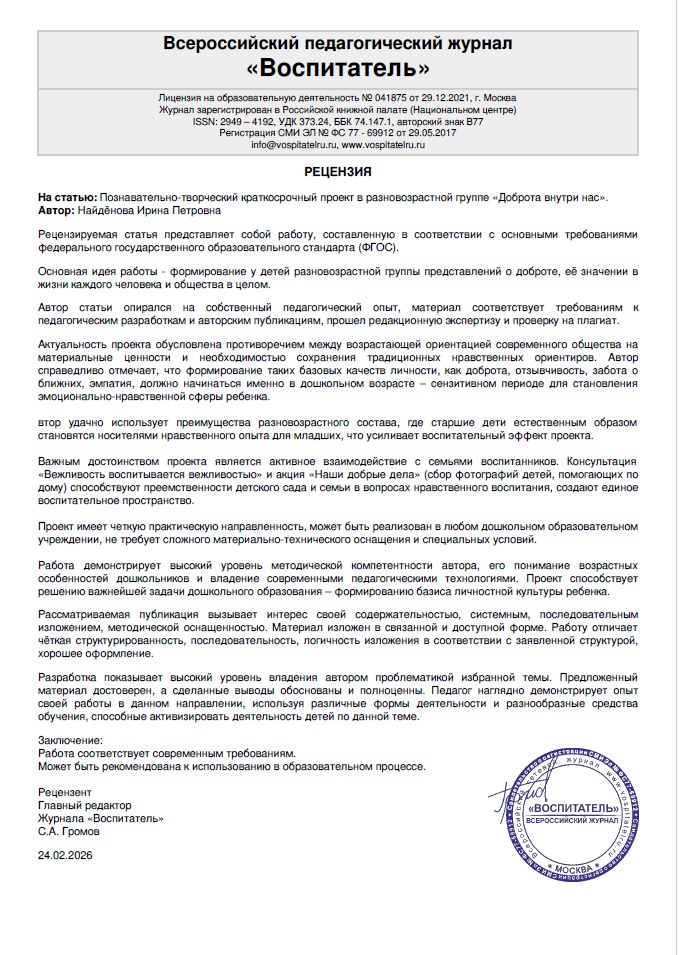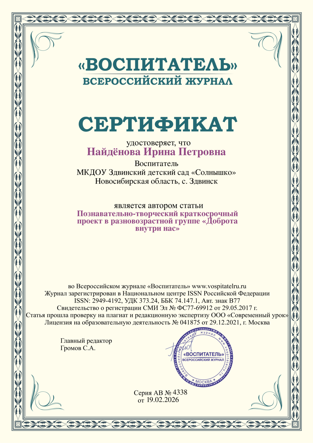 Познавательно-творческий краткосрочный проект в разновозрастной группе «Доброта внутри нас»