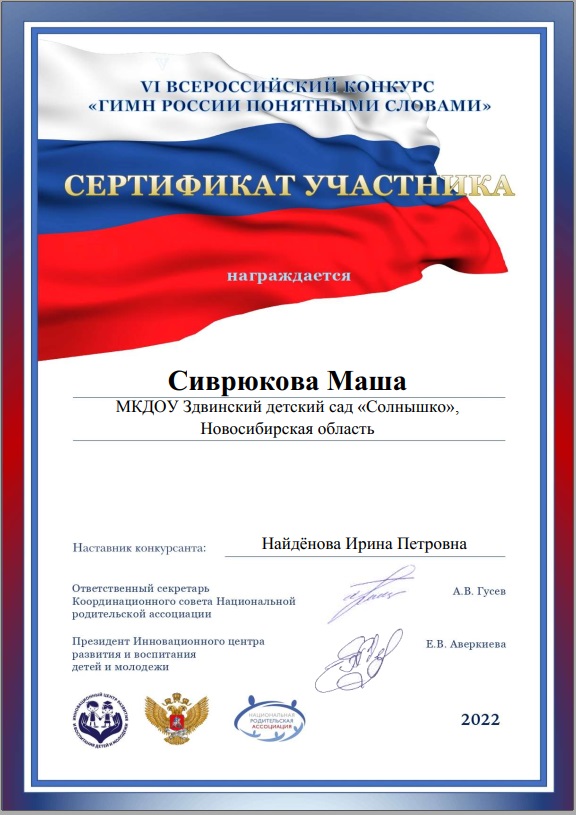 VI Всероссийский конкурс "Гимн России понятными словами", Сертификат участника, ноябрь, 2022г |