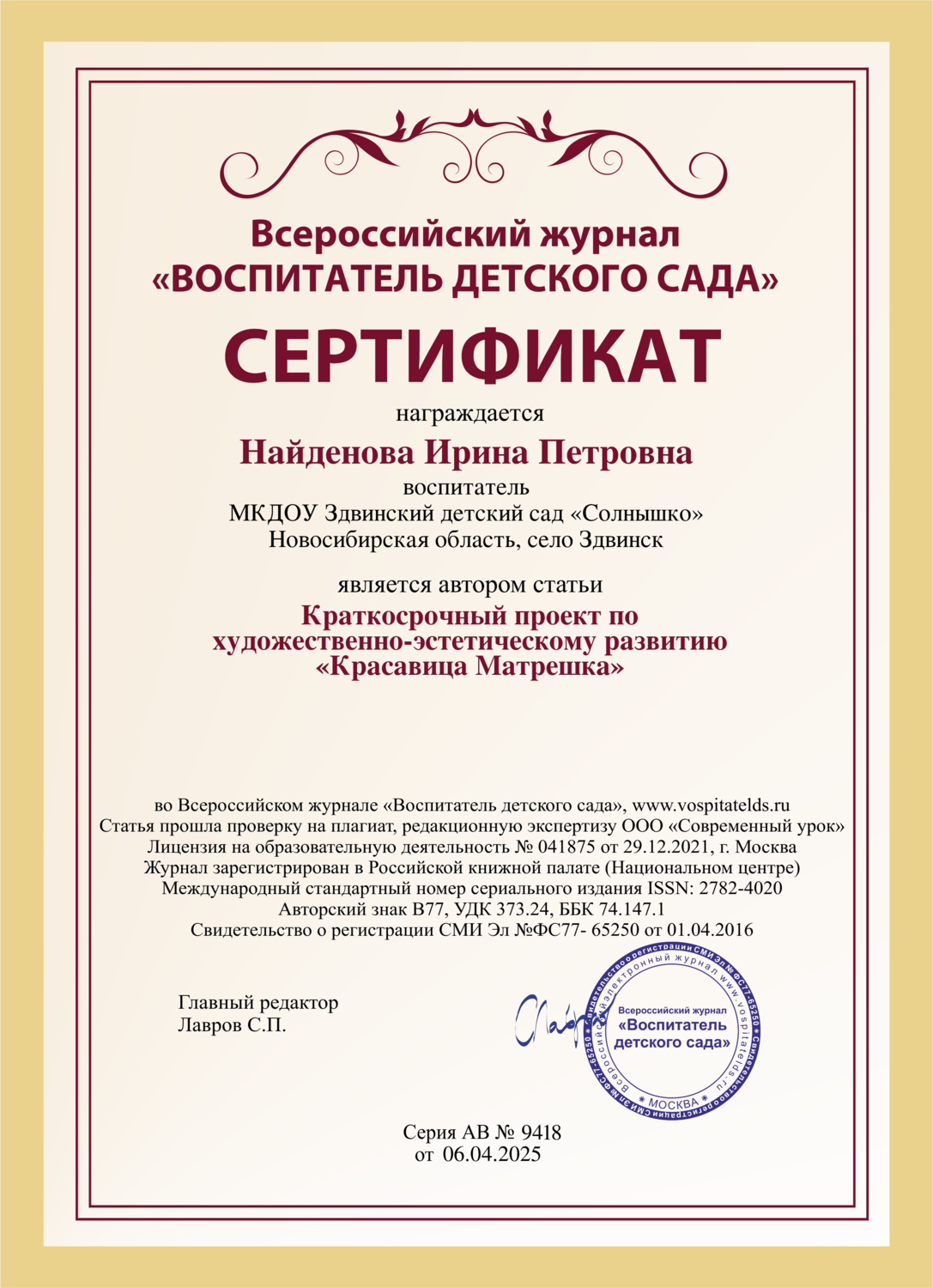 Краткосрочный проект по художественно-эстетическому развитию «Красавица Матрешка»